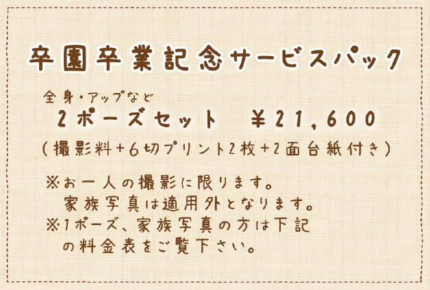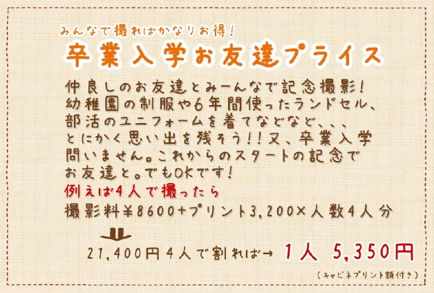 卒園卒業おめでとうございます。これから始まる冒険への第一歩。元気いっぱいの晴れ姿をお写真に残しませんか?みなさんは卒園の時、覚えていますか?この子達はこの写真が一生の宝物になるはず!宝物をいっぱい残しましょう!!幼稚園の制服や6年間使ったランドセル、部活のユニフォームを着て、などお友達プライスもおすすめです。