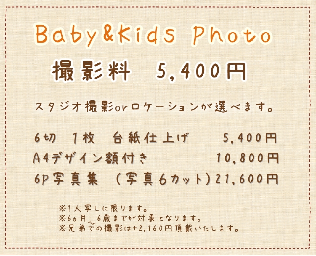 ぷにっぷにのBaby♥元気いっぱいのキッズ!日々の成長をパシャリ!スタジオでは緊張してしまう・・・なんて子も大丈夫!!当館北側の芝公園にてロケーション撮影もOKです!思う存分走って遊んで自然な表情を撮影します。また、はだかんぼ赤ちゃんも小さい頃しか撮れないのでおすすめです!