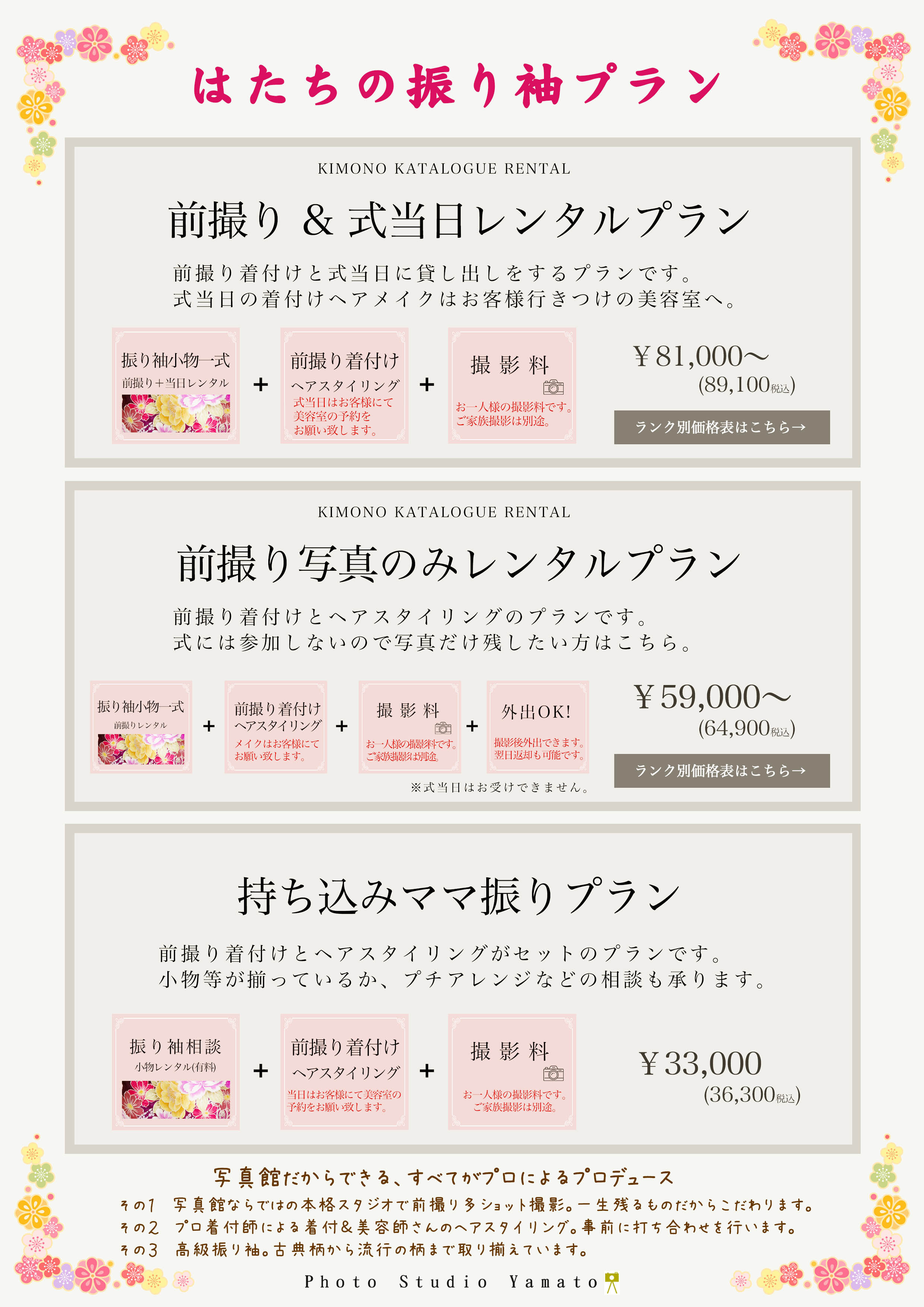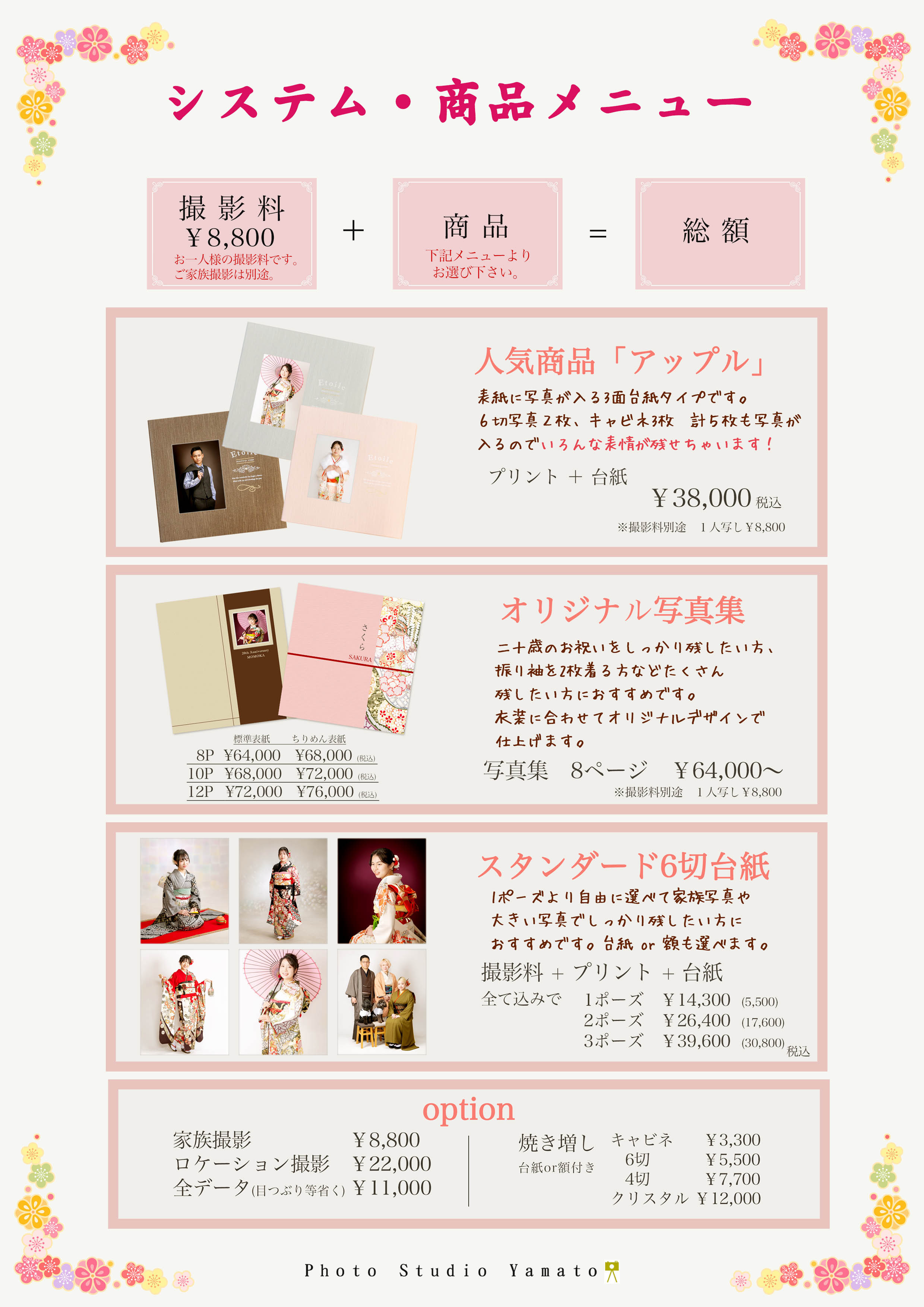 祝20歳おめでとうございます。はたちのお祝い(旧成人式)は一生に一度の大切な節目。みなさんはどんなお写真を残したいですか?ヤマト写真館ではそんな大切な記念日を上品に丁寧にお撮り致します。10年後、20年後、一生見飽きない上品な写真づくり…それが当館のこだわりです。